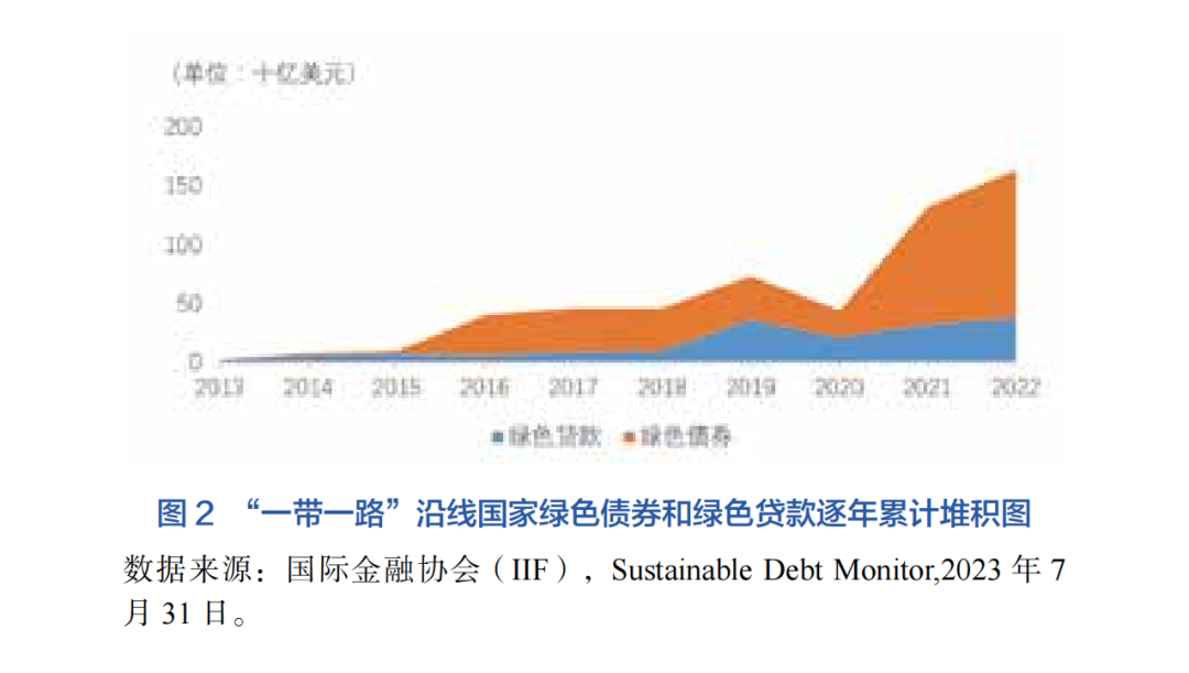 2013-2022年來,“一帶一路”沿線國家的綠色債券和綠色貸款發行量逐年遞增,呈現井噴式增長。綠色債券和綠色貸款發行總額從2013年的不足30億美元增長到了2022年的1645億美元,除了2020年受疫情原因有所下降,其余各年均保持高速增長態勢,2021和2022年年均增長率更達到194%和24%。