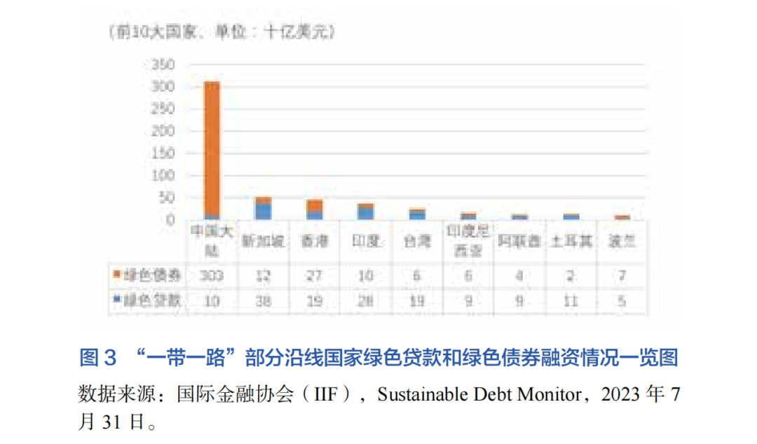 總體來看,近些年來,許多“一帶一路”國家從主要依靠財政資金轉向開發性貸款、項目融資、綠色資本市場債權股權融資等各類混合融資。根據彭博社數據庫統計,2010至2022年,“一帶一路”沿線國家和地區累計共發行綠債4000億美元,占全部綠債發行的20%。沿線國家和地區同期綠色貸款累計超過1930億美元10,占全部綠色貸款累計額的27%。中國、中國香港特別行政區、新加坡和印度分別位居“一帶一路”沿線國家和地區綠色債券發行量前四位,綠色貸款總額也位居世界前列。中國臺灣省、土耳其、阿聯酋、印度尼西亞及沙特阿拉伯在綠色貸款方面也有突出的表現。此外,亞洲實力雄厚的主權財富基金(如中投公司、新加坡淡馬錫、阿聯酋穆巴達投資公司)以及多元化的中長期投資基金(如絲路基金和中國-中東歐基金)成為“一帶一路”沿線綠色股權投資的重要參與方。