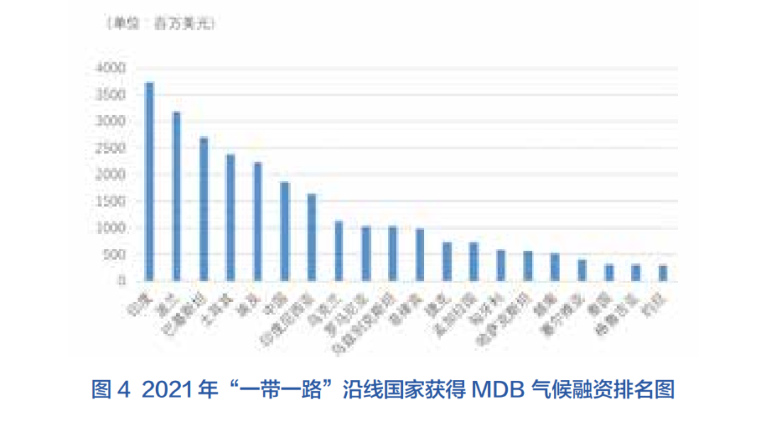《2021年多邊開發銀行氣候融資聯合報告》披露,2021年MDB氣候融資總量達818億美元,其中625億美元用于支持氣候減緩類項目活動,192億美元用于支持氣候適應性項目活動。MDB還調動了共計897億美元配套資金,其中45.7%來自私營部門。2021年,“一帶一路”沿線國家共接受MDB約300億美元的氣候融資,其中印度(37.4億美元)、波蘭(31.9億美元)、巴基斯坦(27.0億美元)、土耳其(23.9億美元)和埃及(22.3億美元)獲得的氣候融資額最大
