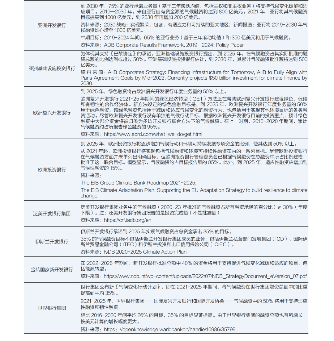 《2021年多邊開發銀行氣候融資聯合報告》還列出了各多邊開發銀行在2020年后一段時期內的氣候融資計劃。例如,亞投行設定了2025年實際批準融資額中至少50%投向氣候融資的目標,歐投行將到2025年把對氣候和環境可持續性操作融資的比重提升至50%以上,歐洲復興開發銀行也設定了到2025年每年對綠色項目的投資超過50%的目標。新開發銀行承諾從2020-2026,包括能源轉型在內的氣候減緩和適應類項目貸款占比達到40%。世界銀行集團則在2021年公布的《氣候變化行動計劃》中承諾,2021-2025年將氣候融資在集團融資總額中的比重提高到35%(見下表)。