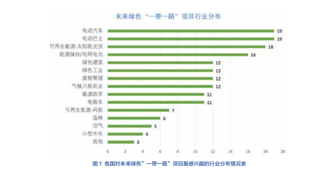 該調研還調查了被調研國家是否有可能在中國在關鍵領域擁有豐富經驗和技術的情況下,在未來十年內將綠色“一帶一路”投資作為優先考慮事項。所有24份回復都表示根據已有信息,政府對綠色“一帶一路”投資很有興趣。當被問及最感興趣的行業,最高的回答是對電動出行(公交車和汽車)的投資意向(24份中的19份),第二位是太陽能(18份),第三位是能源儲存/電網電池(16份)。