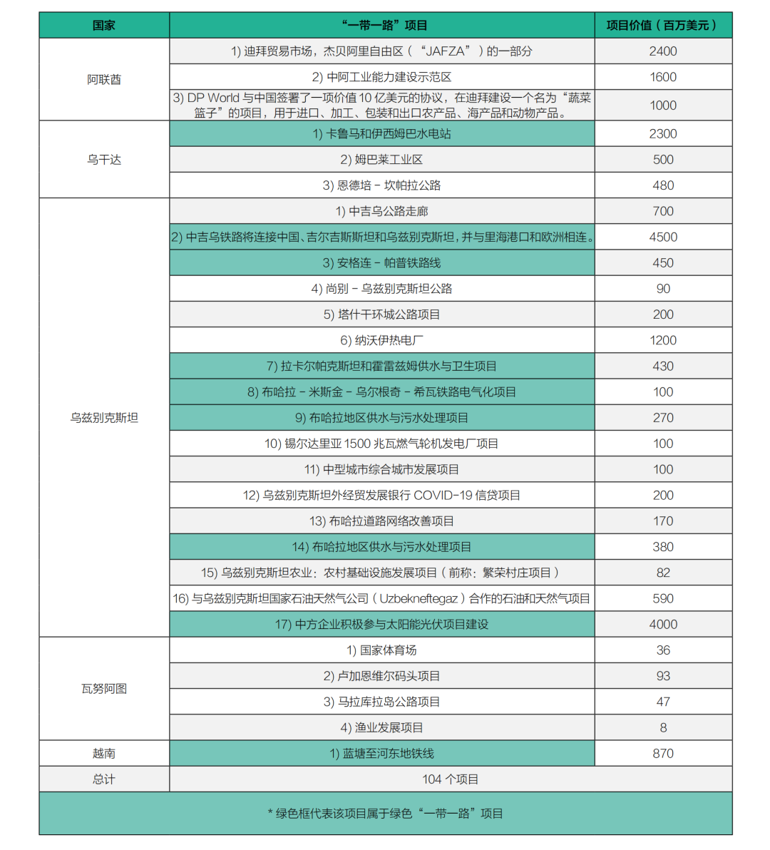 正如表2所示,GGGI成員國的“一帶一路”總投資估計為1,500億美元,涉及104個項目。各國大型“一帶一路”項目數量從越南的最低1個項目到烏茲別克斯坦的最高17個項目不等。按投資金額排名前三的行業是: